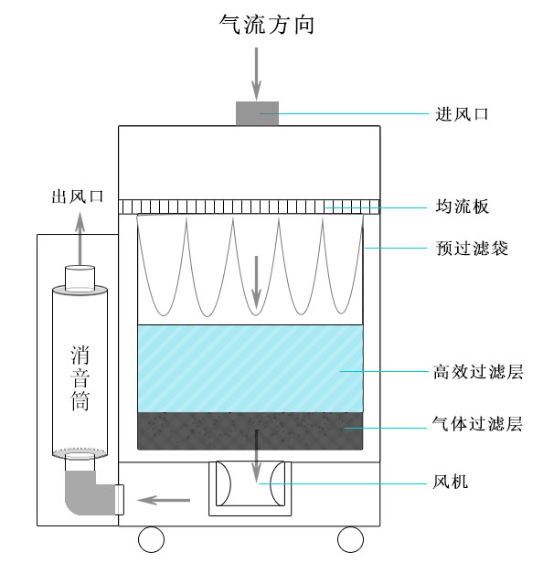 1.煙塵廢氣通過吸煙管/吸煙口進入凈化機內,首先經(jīng)過均流板導流,