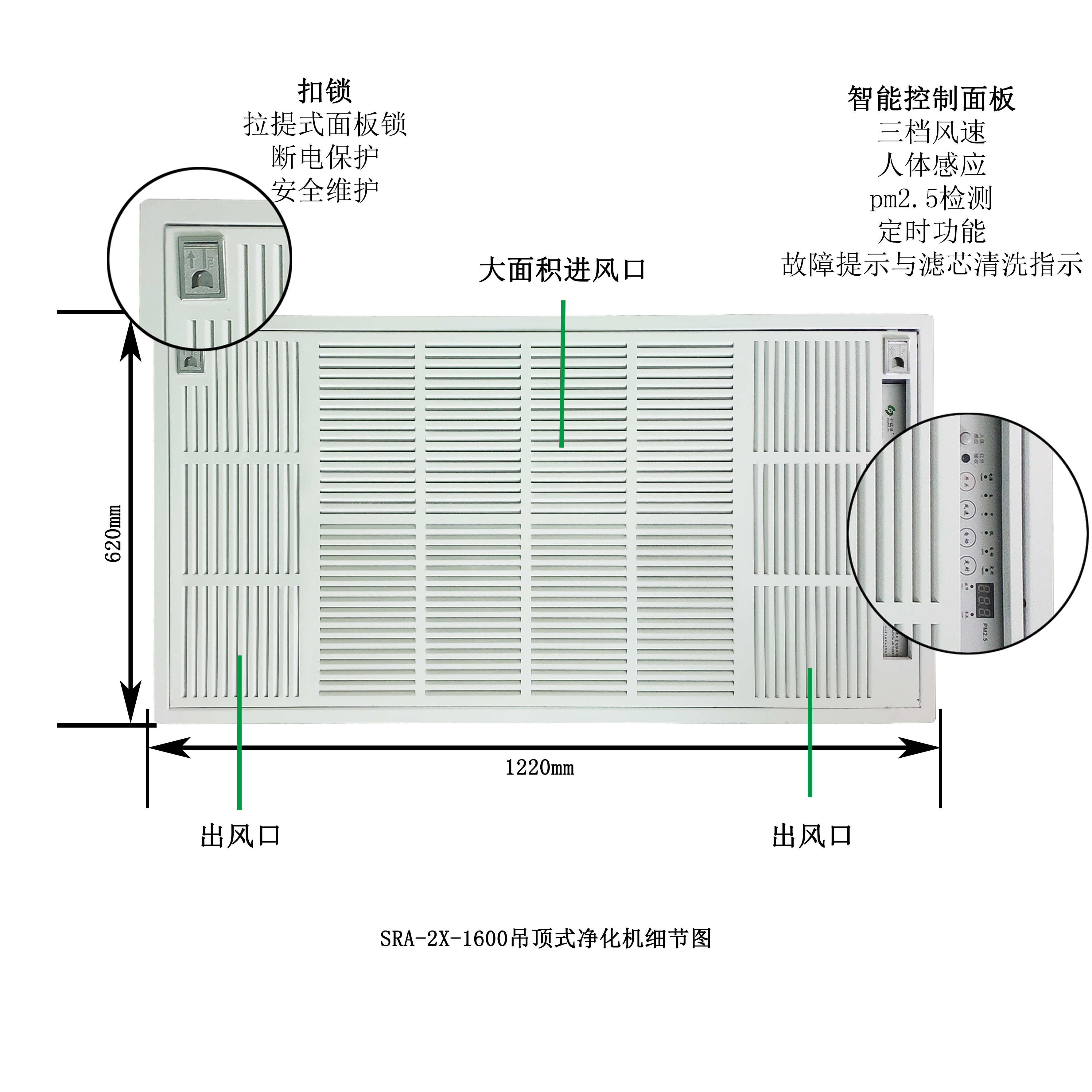 SRA吊頂式空氣凈化機,獨立凈化,無需外排,不用鋪設管道。通過凈化機內置電機,氣流從進風口吸入,進行凈化處理后,潔凈空氣直接循環(huán)在室內,持續(xù)凈化。 該凈化機可完全消除空氣中直徑大小為0.01μm的香煙煙霧、細菌、飄塵等有害物,有效去除空氣中的臭味、異味等,空氣濾凈效果達99%以上。