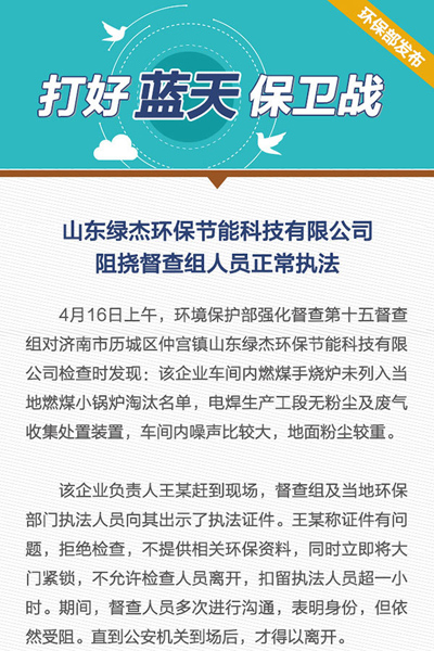 | 4月16日上午,環(huán)保部督查組對山東綠杰環(huán)保節(jié)能科技執(zhí)法受阻一事引起[吊頂式空氣凈化機]環(huán)保行業(yè)人士一眾關(guān)注;由于該公司電焊生產(chǎn)工段無粉塵及廢氣手機處置裝置,車間內(nèi)噪聲異常打,地面粉塵嚴重等各種原因,環(huán)保督察組對其依法采取相應(yīng)措施,貴公司以證件有問題,拒絕檢查,同事扣留執(zhí)法人員超一小時,