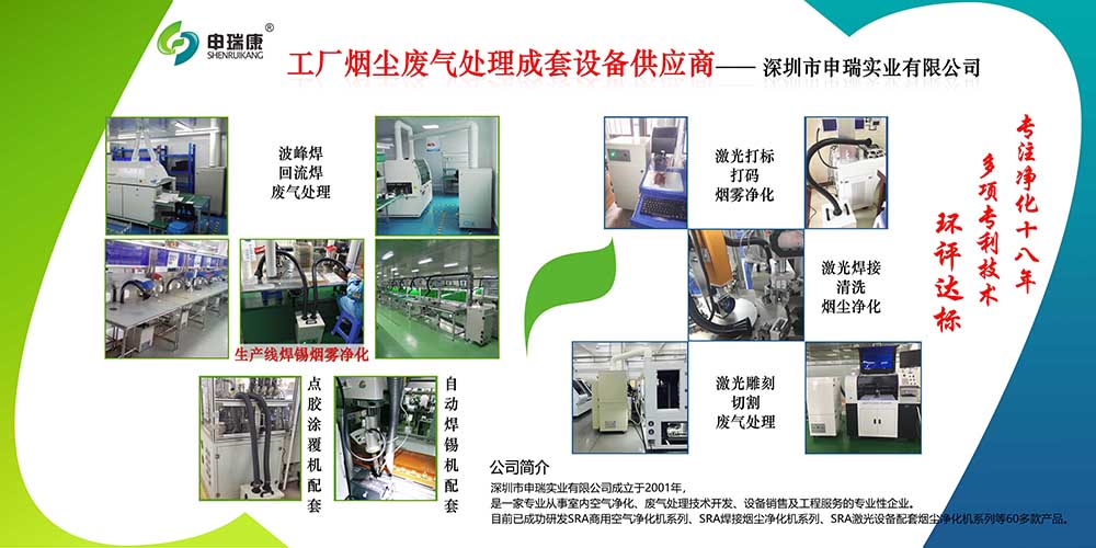 申瑞研發(fā)與生產(chǎn)的專業(yè)針對工業(yè)煙塵廢氣處理及成套設備,廣泛應用于激光加工、波峰焊、回流焊、點膠等領域,凈化率達到99.99%,是您環(huán)評環(huán)保達標的首選。