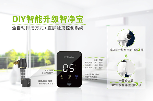 值得一提的是,為進(jìn)一步方便用戶使用,提升產(chǎn)品體驗,榮事達(dá)為第五代、第六代智能前置過濾器分別打造兩款定制化新品,量身融入智凈寶自動排污模塊,2秒即可直接加裝升級。專屬定制的DIY智凈寶配備了直屏觸控排污系統(tǒng),輕觸即可任意設(shè)置排污時間和排污天數(shù),實現(xiàn)完全自主排污;獨特排污閥閉合自檢能力,徹底排除漏水風(fēng)險,方便省心,使用無憂。