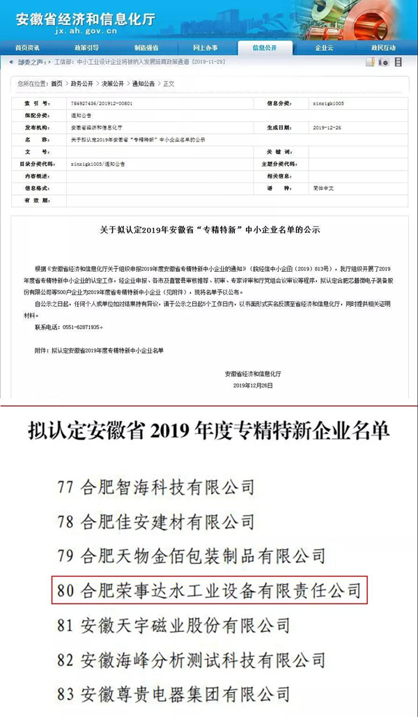 12月26日,安徽省經(jīng)濟(jì)和信息化廳公布了2019年安徽省“專(zhuān)精特新”企業(yè)名單,合肥榮事達(dá)水工業(yè)設(shè)備有限責(zé)任公司憑借在專(zhuān)業(yè)化、精細(xì)化、特色化和創(chuàng)新化方面的獨(dú)特優(yōu)勢(shì)成功入選。