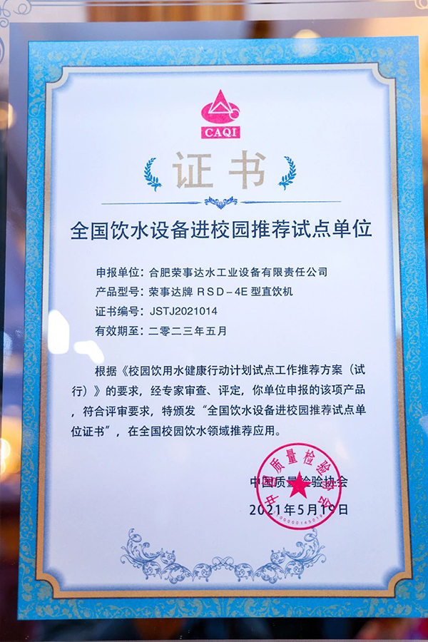 為推動(dòng)飲水設(shè)備進(jìn)校園工作持續(xù)性、健康性地發(fā)展,向消費(fèi)者、學(xué)校和社會(huì)推薦好企業(yè)、好產(chǎn)品,2021年4月,中國(guó)質(zhì)量檢驗(yàn)協(xié)會(huì)開展了全國(guó)飲水設(shè)備進(jìn)校園推薦試點(diǎn)單位工作,經(jīng)企業(yè)自主報(bào)名、專家資料審查和網(wǎng)上公示,最終遴選了20家全國(guó)飲水設(shè)備進(jìn)校園推薦試點(diǎn)單位,榮事達(dá)憑借過硬的產(chǎn)品和服務(wù)質(zhì)量成功入選。會(huì)上,鄧瑞德理事長(zhǎng)、魯建國(guó)所長(zhǎng)、白雪濤所長(zhǎng)、劉子玉主任分別為20家企業(yè)頒發(fā)了證書。