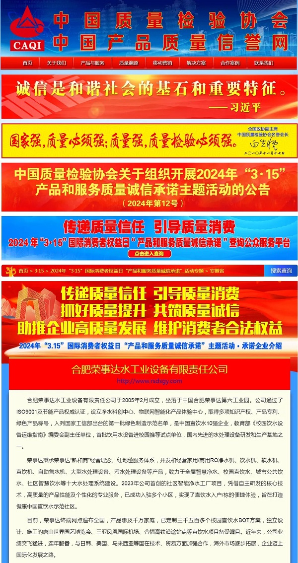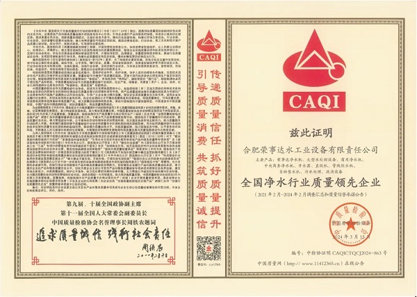 在由中國質量檢驗協會主辦的2024年“3·15”產品和服務質量誠信承諾的主題活動中,榮事達水工業公司憑借卓越的產品品質及良好的社會形象,獲得協會以及權威專家的一致認可,榮膺 “全國產品和服務質量誠信示范企業 ”“全國凈水行業質量領先企業”“全國凈水行業質量領先品牌”“全國產品和服務質量誠信品牌”“全國質量檢驗穩定合格產品”“全國質量檢驗信譽保障產品”“全國消費者質量信譽保障產品 ”多項榮譽。