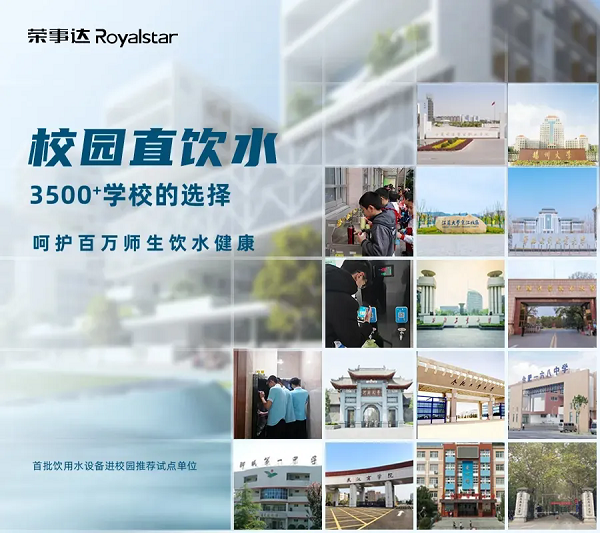 榮事達水工業公司始終關注師生的飲水安全,通過提供智能飲水服務方案,為師生創造一個健康、便捷的飲水環境。公司先后承建了中國科學技術大學、江蘇省丹陽市第五中學、新疆烏魯木齊五一農場完全小學、宿松東北新城金色搖籃幼兒園等3500多所學校的直飲水工程,呵護百萬師生飲水健康。