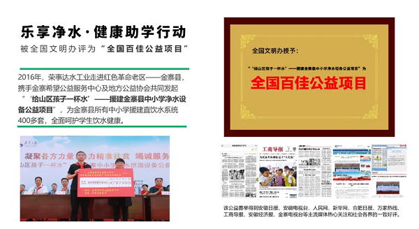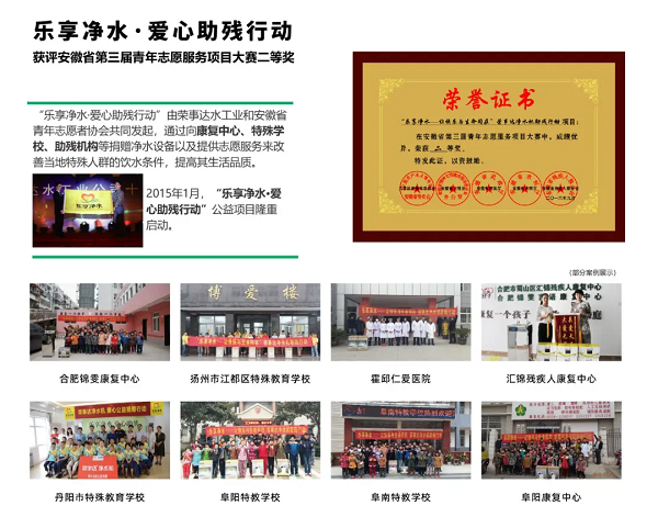 榮事達水工業公司積極投身于公益事業,其公益行動廣泛覆蓋健康助學、愛心助殘、精準扶貧及鄉村振興等多個領域,公益的足跡遍布全國。公司用實際行動踐行社會責任,彰顯企業擔當,贏得了社會各界的廣泛贊譽。
